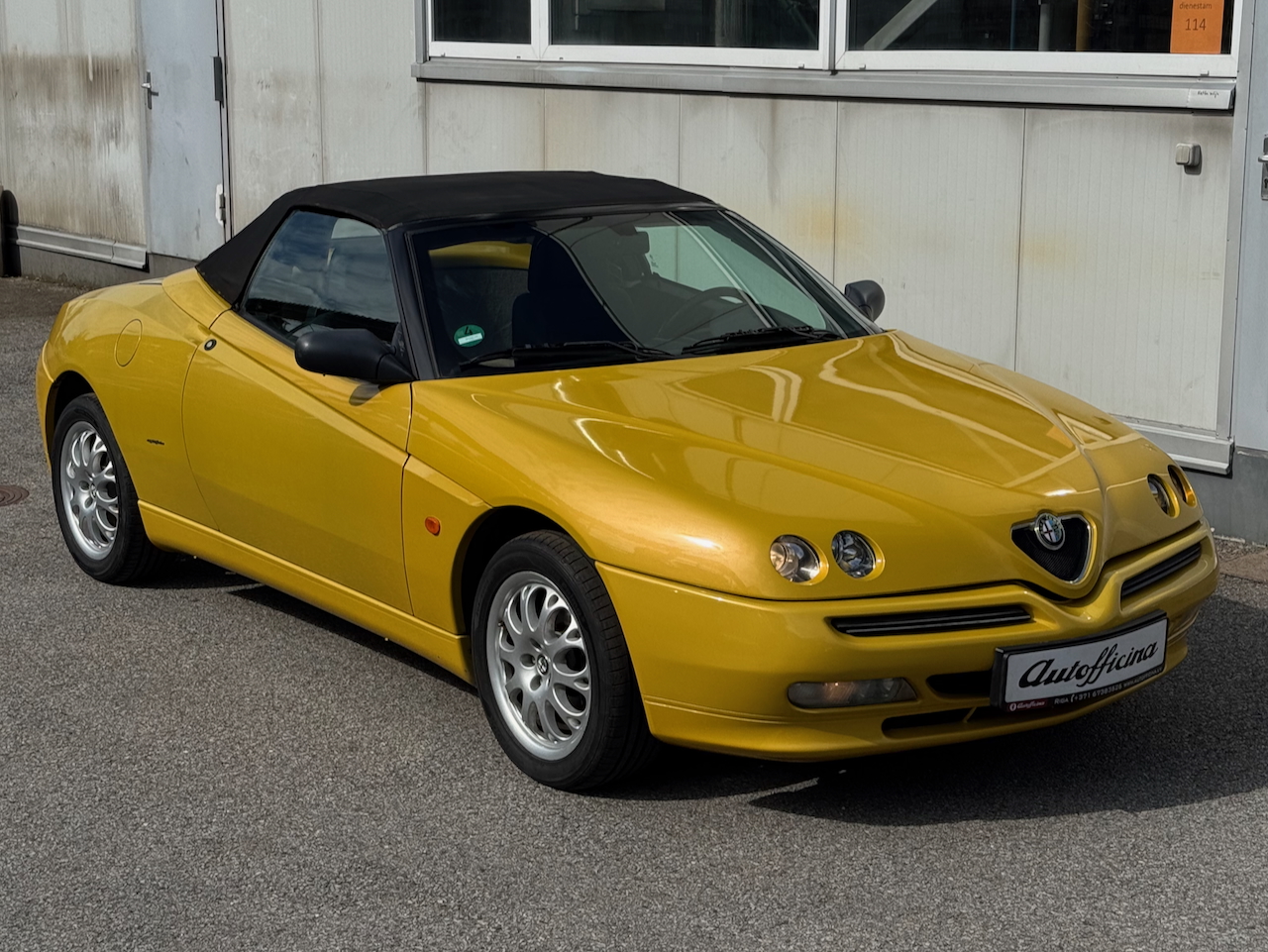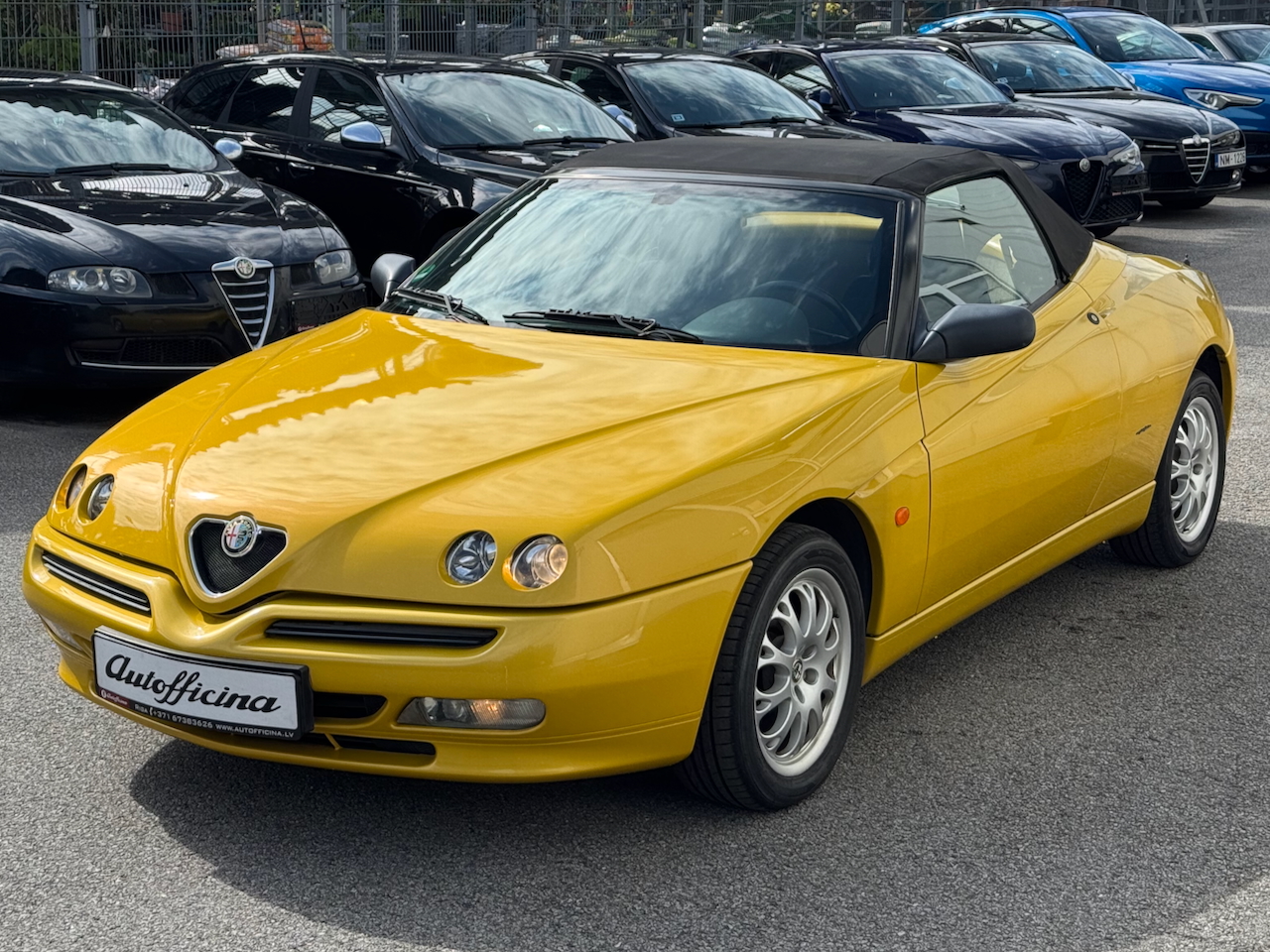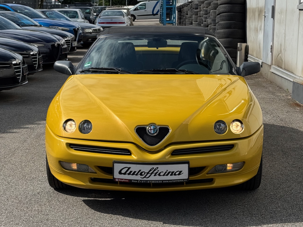 Alfa Romeo Spider 1.8 16V, 144zs Twin Spark motors, atjaunotais otrās paaudzes modelis īpašajā "Giallo Zoe" dzeltenajā krāsā aprīkots ar elektriski vadāmu jumtu.